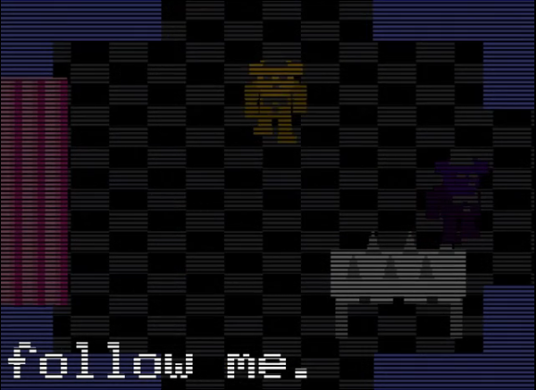 Even though Purple Guy also used SpringBonnie at some point, the reason for Shadow Freddy being what the Puppet is masquerading as in Follow Me is because it’s something the spirits would find familiar. Being lured by a suit. The suit is actually purple this time, and once it reaches the “secret” room, Purple Guy runs out and dismantles them.
